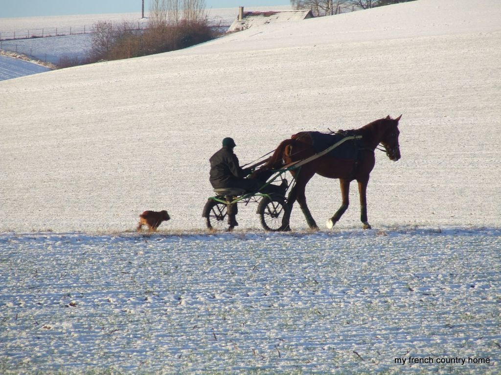 Ideal photo subjects for me: horses, snow and France. Perfect photos. I took a photo which is on my blog today, of a statue of a surfer with a Santa hat. Quite a contrast to your snowy world.