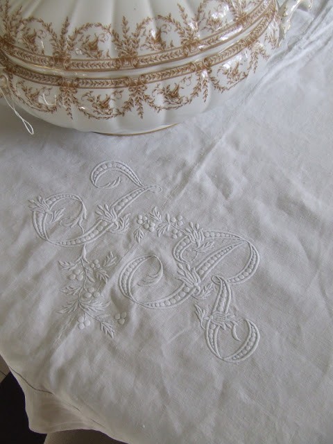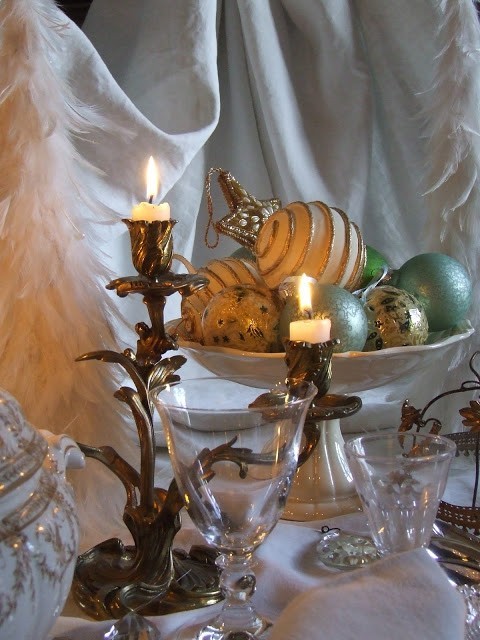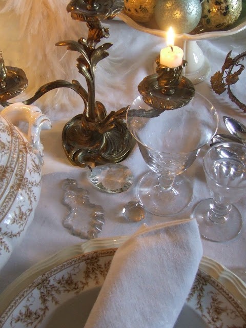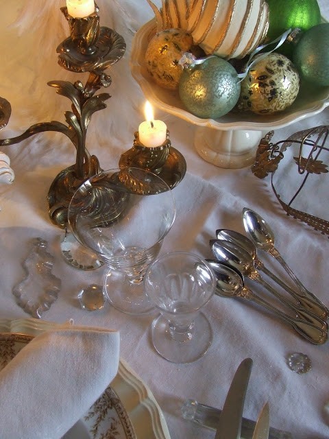 I used an antique soup tureen and soup plates, antique cutlery; crystal knife rests; some cool feather christmas trees I found this week; and instead of laying all this onto a real tablecloth I borrowed a wonderful metis embroidered sheet from my stock.
