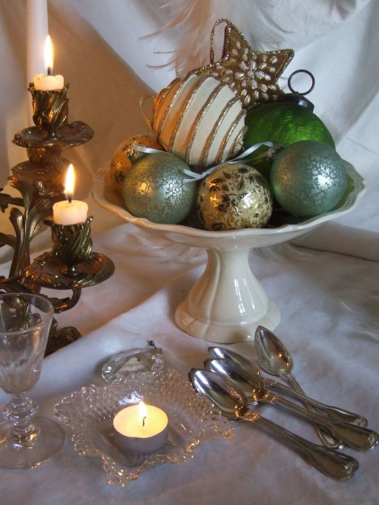 I used an antique soup tureen and soup plates, antique cutlery; crystal knife rests; some cool feather christmas trees I found this week; and instead of laying all this onto a real tablecloth I borrowed a wonderful metis embroidered sheet from my stock.