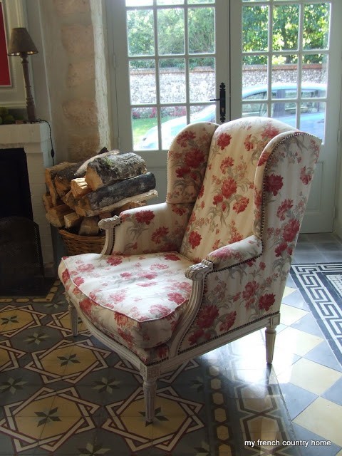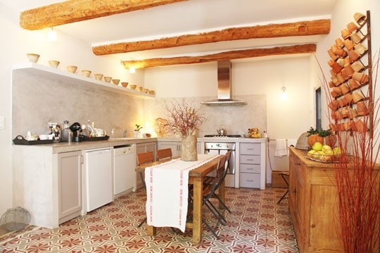 It is not unusual in the old houses like ours, to find a decorative pattern used in the entrance hall and the kitchen with wooden parquet, or brick red tomettes laid in the adjacent living and dining areas.