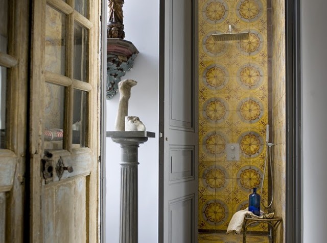 I love the subtle colours of the floors, they seem to bring warmth and whimsy to today’s neutral tones. In the bathroom below 19th century tiles have been reworked as a the wall on a walk in shower. Gorgeous yellow with the grey woodwork
