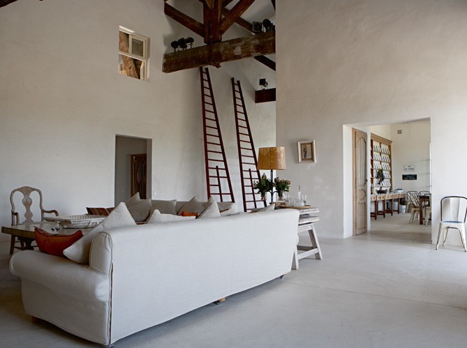 The furniture is not overdone, mostly vintage or brocante pieces, the accent is on colour, patina and textures. The bareness of the walls in the sitting room provide a striking set for the two huge orchard ladders.