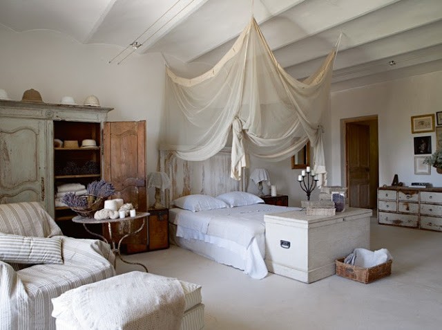 Fittingly it is the bedroom that is given the most comfortable treatment, with a big soft armchair, and of course the wonderfully simple baldaquin over the bed.