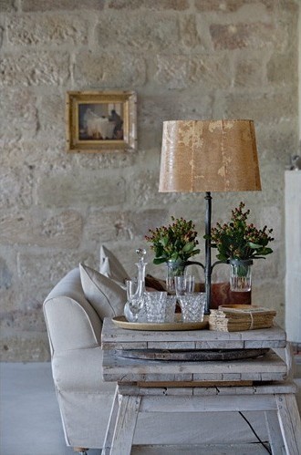 This is my favourite picture,; I love the grey of the lamp stand against the neutral stone wall.  The way the side table height has been raised, and those amazing little vases attached to the lamp – those I want!