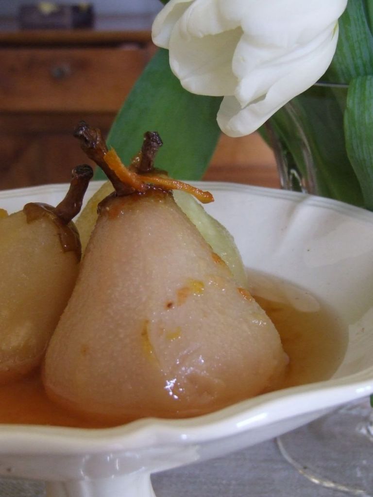This sounds lovely, it's also good to try with lavender honey replacing some of the sugar. But for me, pears cooked in red wine, some sugar and a cinnamon stick is the best. There is something about the mingling of the natural pear juices with the wine that makes it so delectable. I was once surprised by a very civilised guest who enjoyed it so much he asked us permission to lick the serving bowl at the end! Taken aback, but couldn't help loving him for his appreciation. We are still friends to this day.