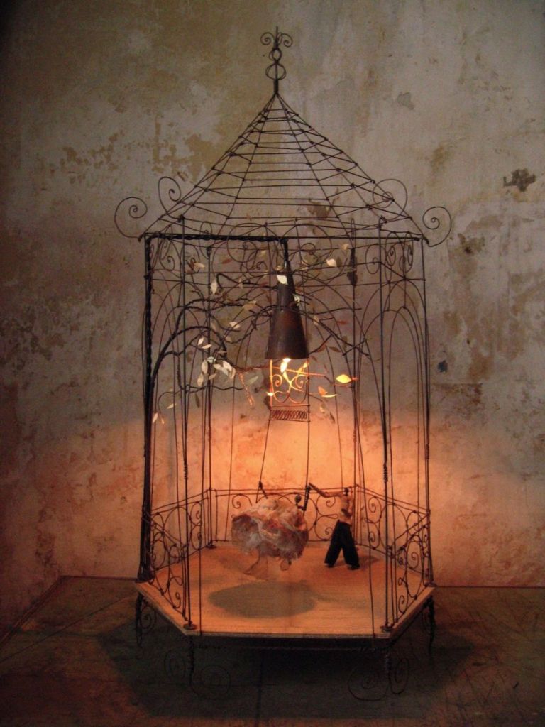 The open cage with the couple sitting on the bench is incredible, adding the light to shine down on them makes it even more divine.