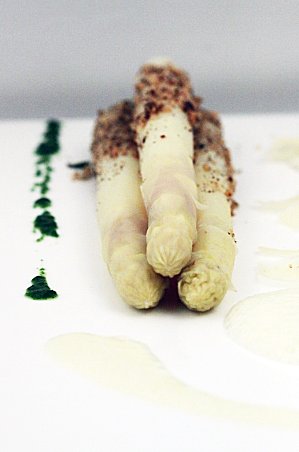 To prepare asparagus as we do, snap off the lower part of the stem with your fingers, and if necessary peel away the very thin outer fibre of the stem, up to the tip. Rinse in cold water, then cook in a pan with a little olive oil, and a heavy lid over the pan to keep in the moisture. After 10-15 minutes the asparagus should be tender and just beginning to brown.