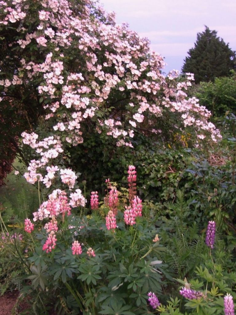 [blank]The white border in front of the terrace is flowering well at the moment, and the climbing rose Félicité Perpétue at the gateway is blooming with its tiny, pink buds, and fragrant double rose heads.[blank]