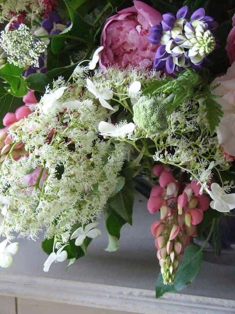 I just found this post, and wanted to tell you how much I enjoyed your arrangement of beautiful flowers. Oh, the lupines, and that feathery white stuff, and the roses! Oh my.