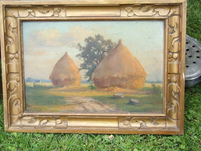 the clock is exquisite…the monogrammed linens so fine…the last painting with the grain stacks/hay (??) looks like it was painted by a famous Impressionist…I think your loot is a lot and also fabulous!