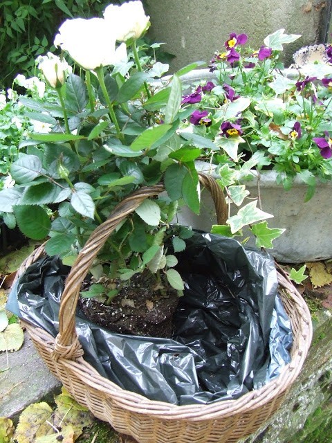 Simply line the basket with a sturdy plastic bag, and place your bedding plants in, being careful to position them so the basket is pretty seen from all sides.