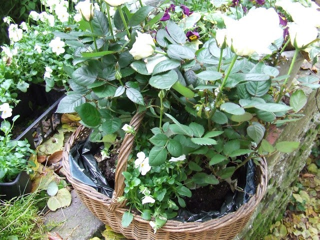I put a couple of white roses in the centre, and some tiny white pansies all around the edges.