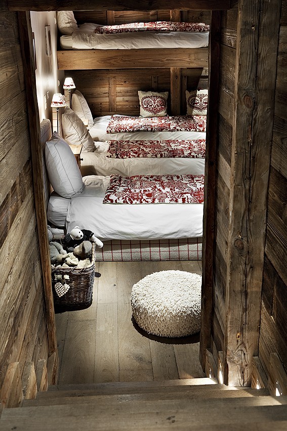 But oh my word, look how ski chalets have changed ….. the traditional french chalet was a lot of wood, gentle fabrics, greenery, red and white cross stitch, reindeer motifs …