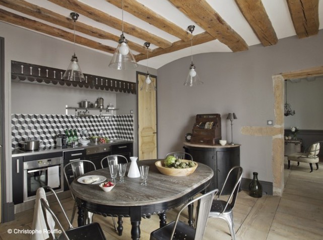 I love the mix of styles in this room, steel chairs with the oval table and rounded cupboard against the wall.[blank]
