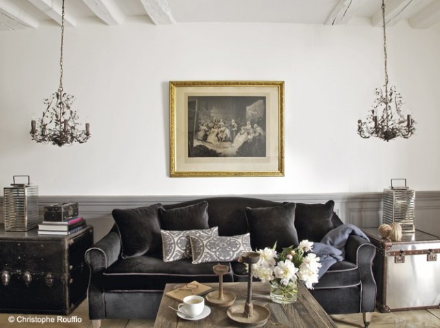 I love those twin chandeliers and that lovely dark grey sofa! Gorgeous! I wish I could come to Normandy…sigh, maybe someday! 🙂