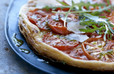 With a pack of puff pastry, I can improvise a wafer thin French apple tart for dessert; mini cheese straws for an appetizer with a glass of wine or this savoury tart for a first course or for a lunch with girlfriends.