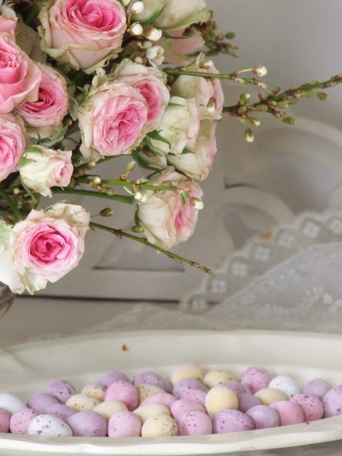 Happy Easter Sharon … the flowers are gorgeous and I love the little pastel speckled eggs …. so sweet!