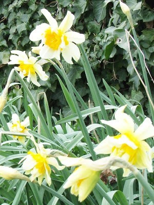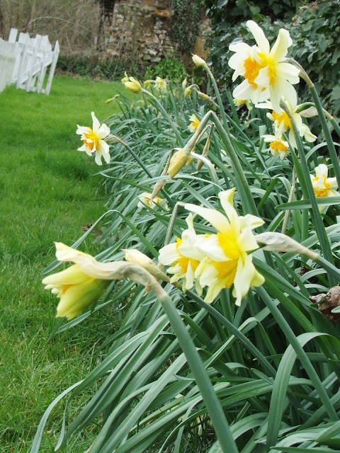 So bright & cheery to see these daffodils on a dismal April day here in New Hampshire. All my tulips are on stand-by as we have yet another "Winter Weather Advisory" warning for sleet & freezing rain. I've been so obsessed with tulips that I've neglected planting any daffodils in my gardens & yard. After seeing the swath of daffodils in your blog banner, I know I'll be ordering way too many in a flower frenzy & be smacking my forehead in despair in the Autumn as reality sets in when I have to plant them! Even though your weather might be rainy, I'm sure it's always wonderful to look outside at such beauty blooming in your garden. Happy Spring!