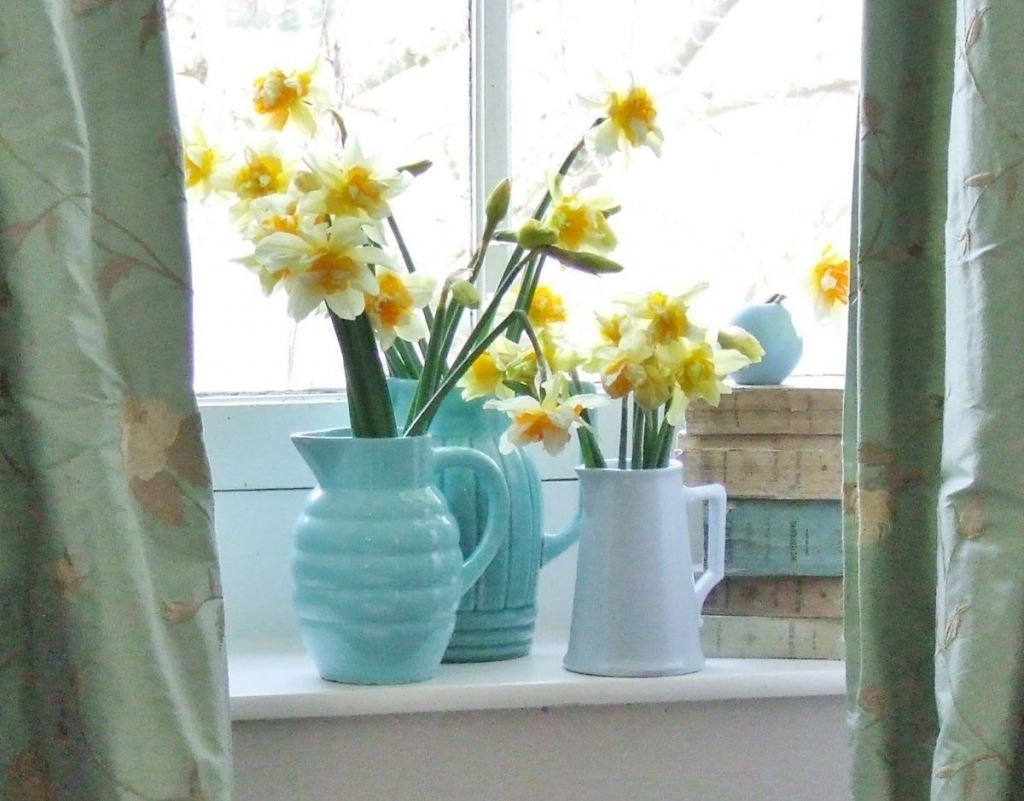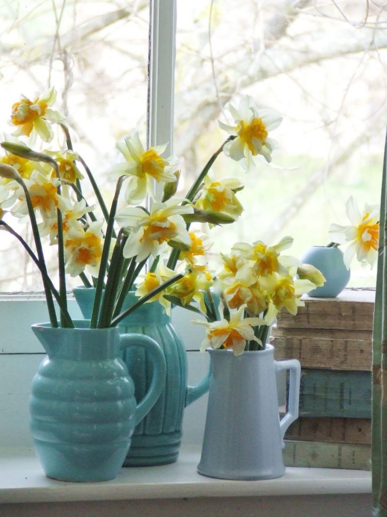 I love the daffodils in those wonderful pitchers. Hope the warmer weather comes soon.