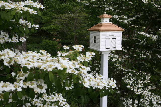 Virginia’s birdhouses are made in Pennsylvania by an Amish man. They are made of wood, with a cedar roof that turns silver gray with time. The birdhouse comes with a bracket to fit snugly onto a 4″ x 4″ post and stand proud in your garden.[blank]