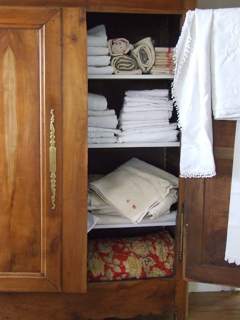 [blank]And the precious linens were kept under lock and key, in the traditional decorative wardrobe called an armoire, whose doors swung open to reveal piles of neatly folded heavy linens, ruffles of delicate lace, and countless napkins and dish cloths. The key to open this treasure trove was generally kept safely tied around Madame’s waist![blank]