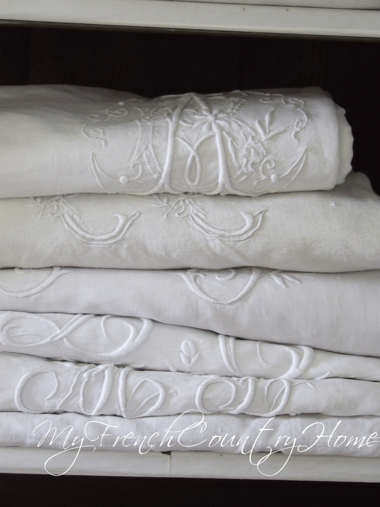 We have purchased an Antique French Trousseau Armoire for our new bedroom – so hearing the story behind the linens that filled these beautiful cabinets is so special. I need to select some linens like this these to put in to the cupboard – and to enjoy.