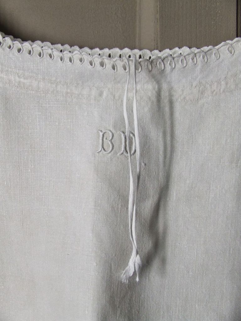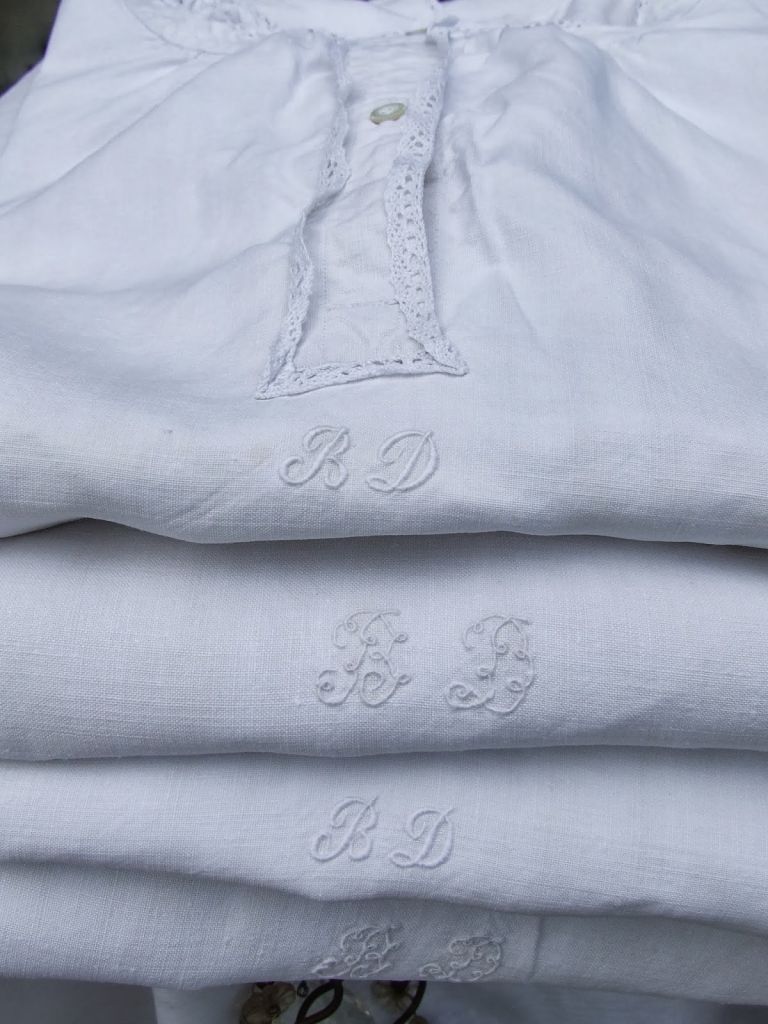 [blank]Now and again I come across a complete ‘batch’ of never-used nightdresses, all in the most beautiful linen, and embroidered at the opening with the young women’s initials. Why never worn? who knows…. maybe she passed early, maybe the wedding was called off, maybe she ate too much wedding cake and outgrew the gowns![blank]