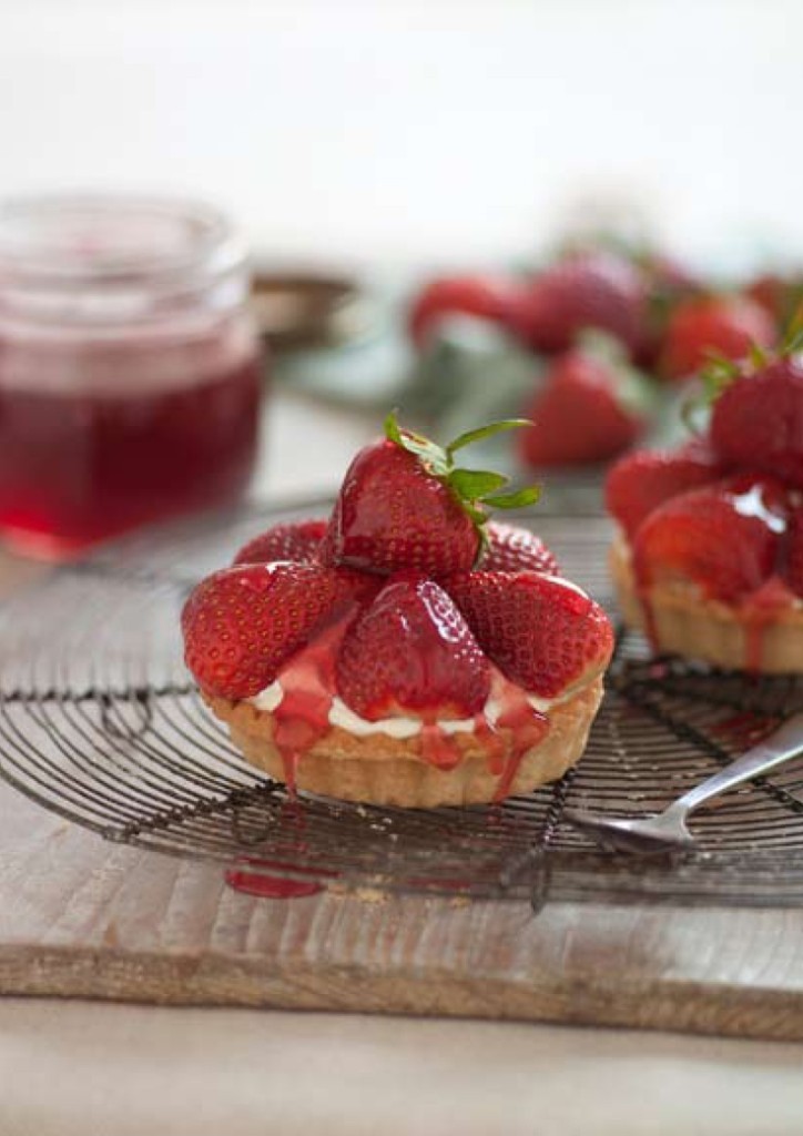 To assemble your tart, or tarts, remove the pastry case from the tart mould (this isn’t obligatory but it looks so much prettier), cover the pastry base with the cream then carefully lay the strawberries all over in neat circles. If the strawberries are enormous you may want to cut them in half.