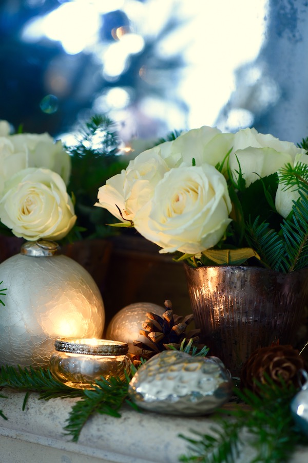 So here for you is a version of Christmas in our home, a colour scheme I love. It feels peaceful and gentle, and using fresh roses amid the traditional decorations adds some freshness to the holidays.  When they start to droop, its easy just to remove the rose heads and replace with a few new blooms.