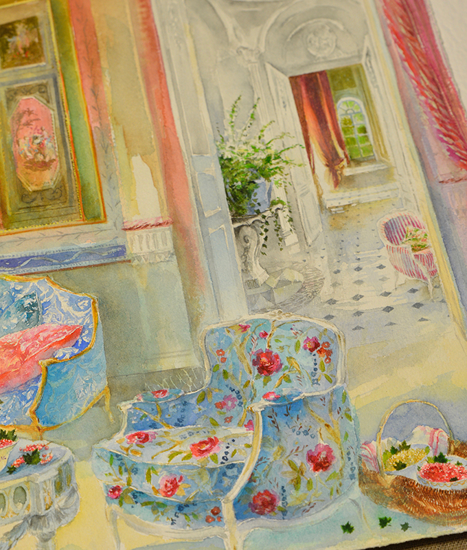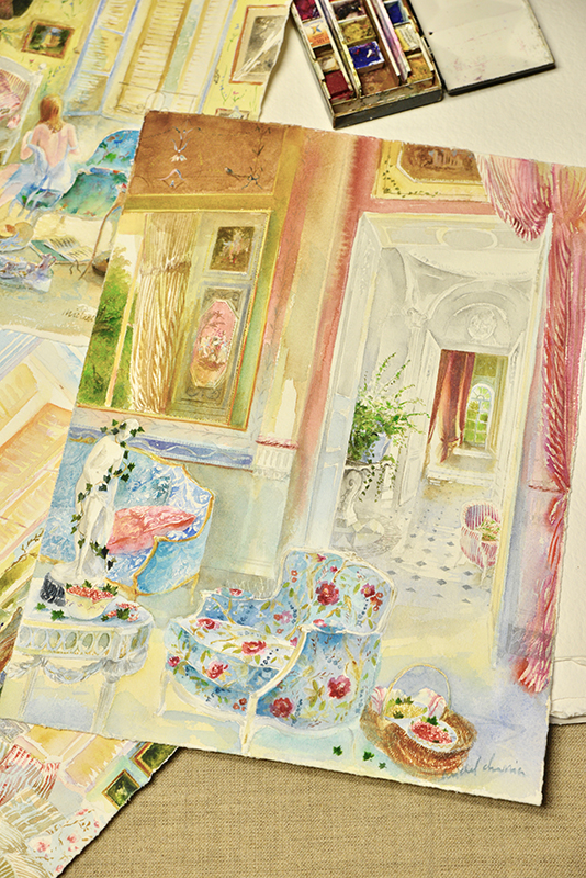 Inside his home, he showed me some of his watercolours, starting off with the beautiful house portraits, both inside and out. Michel lives in Normandy, and besides painting scenes inspired by his own home and family, he also is commissioned to paint portraits of other people’s properties.
