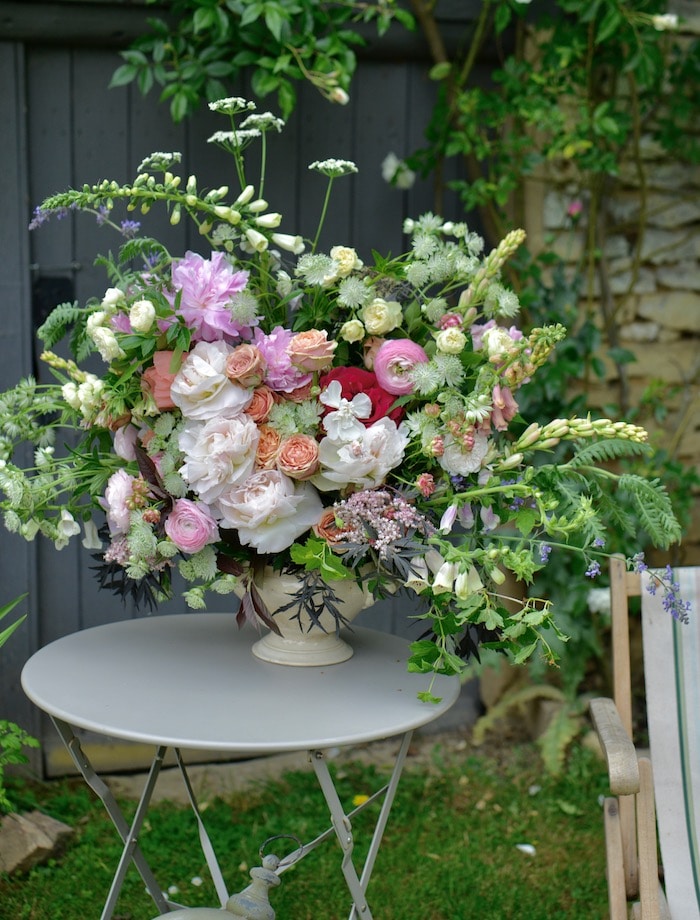 For this arrangement I used an old soup tureen, which you know I often favor.  Roses, peonies, astrantia, black elderflower, cow parsley, foxgloves and catmint.  I placed some wire into the tureen, which I have always found the most effective way to balance a big arrangement. Also wire allows the flowers to last for longer than if I used florist foam.
