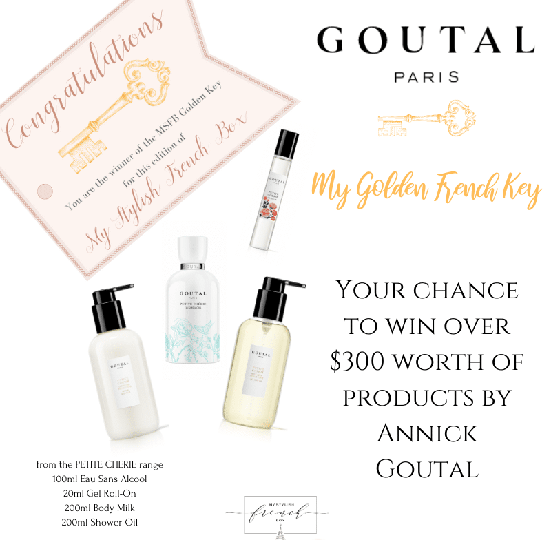 The golden key is such a fabulous idea that makes opening the MSFB even more exciting and surprising! The bonus of winning Annick Goutal products is superb! I remember going through CDG after my first trip to France and seeing the duty free shops, especially the perfumes! On that trip I purchased Les Nuits d’Hadrien by AG and absolutely loved it. I have such a perfume obsession, especially any that have strong notes of ambre, patchouli and woods. Thank you so much for sharing such stylish French brands. I’m hoping I’m lucky enough to win the February box! Off to share the give-away!