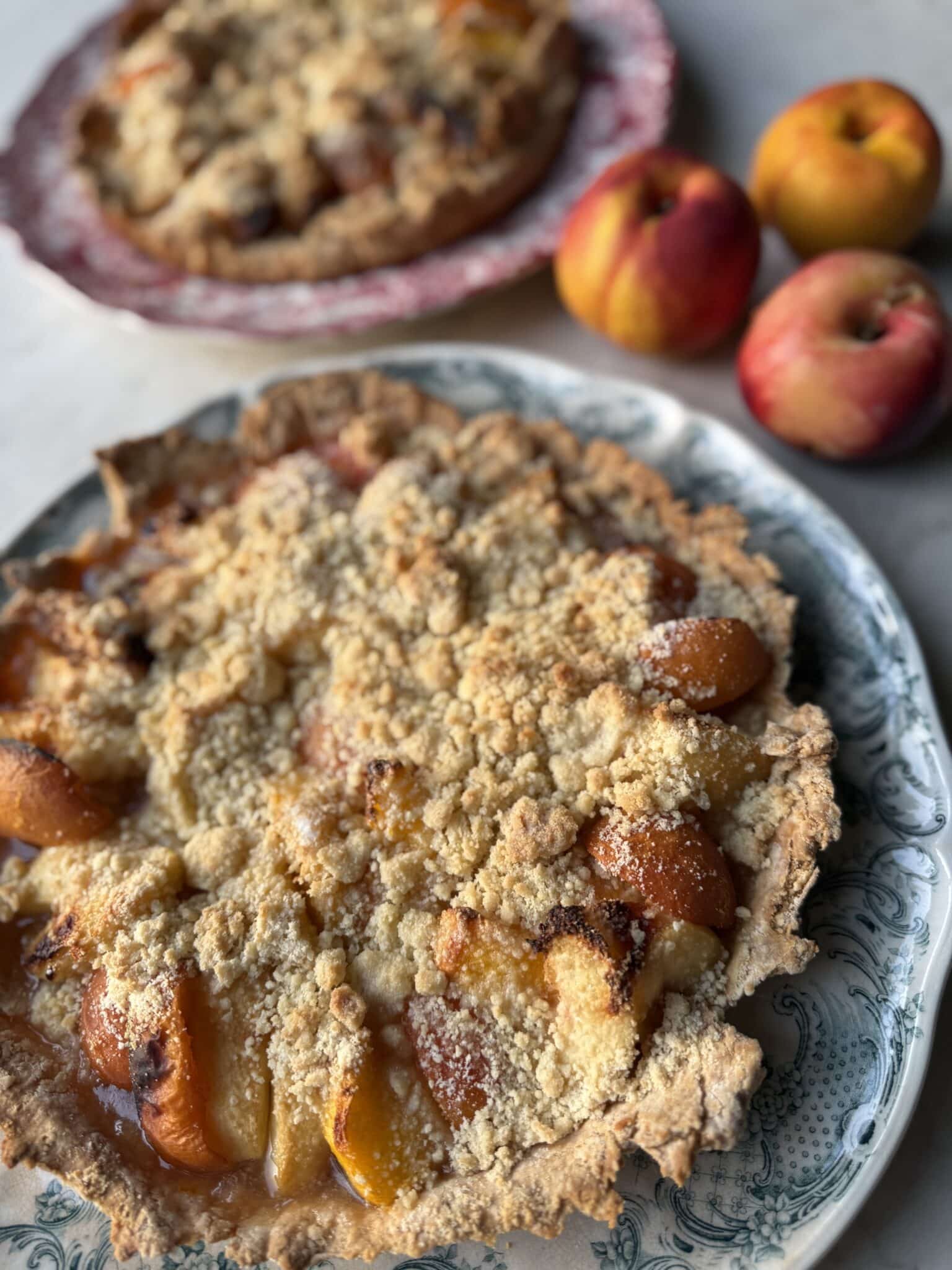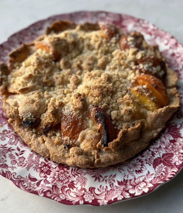 I cover the pastry base with the apricot quarters and peach slices, arranged snugly so there’s no pastry showing. Sometimes I bake them like this, but more often I add a crumble topping — ground almonds, a little flour, sugar, and butter rubbed gently together until it resembles fine crumbs. Scattered across the fruit, it bakes into a golden, nutty topping that makes the tart even more irresistible.
