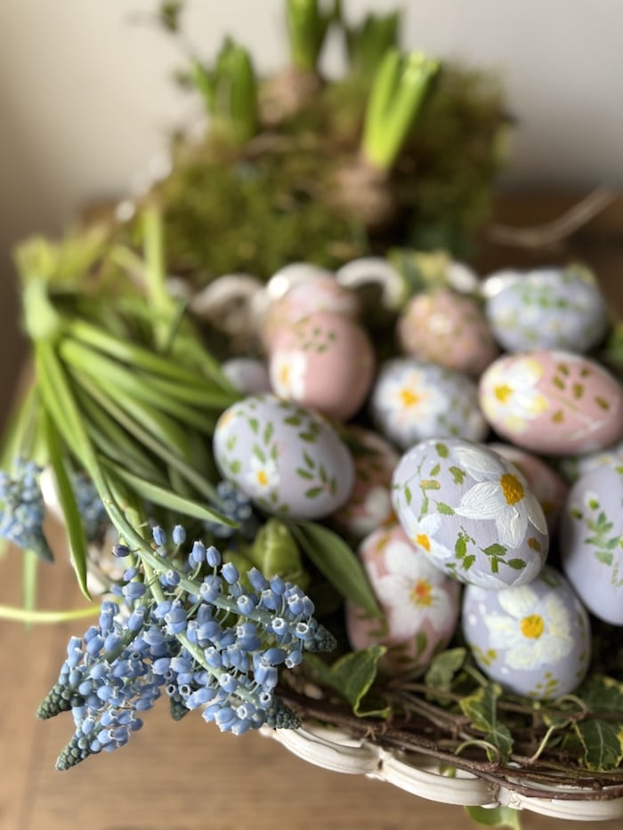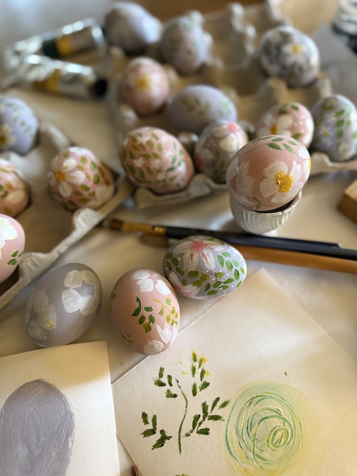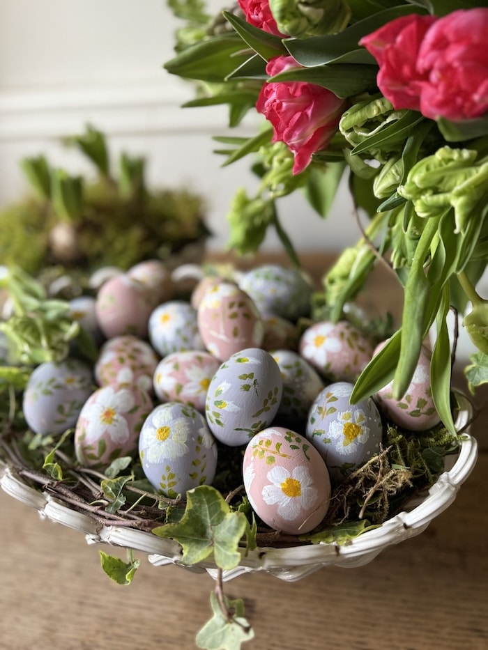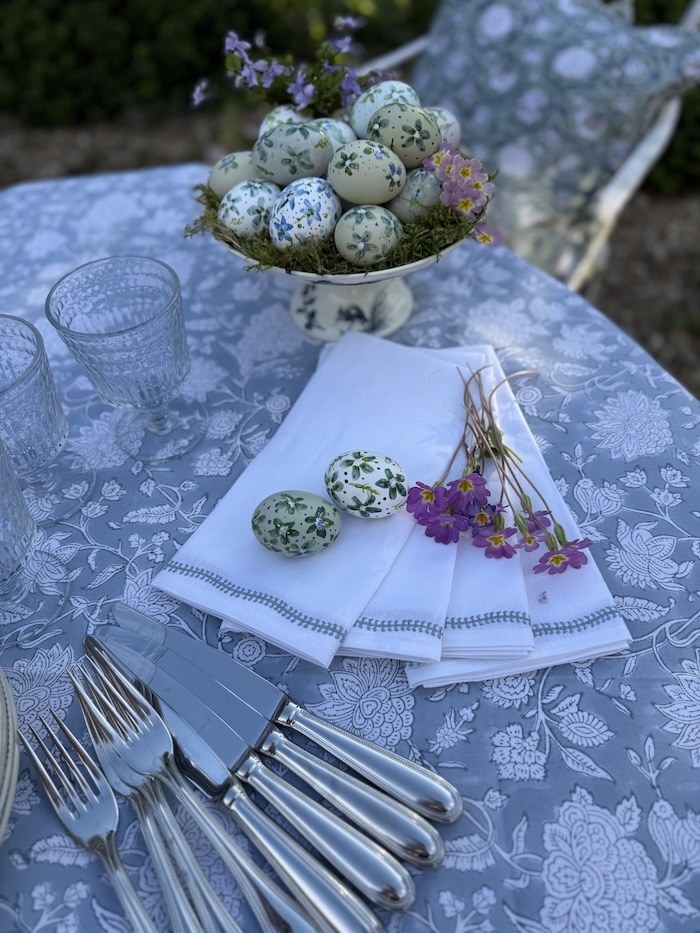 I love creating handpainted eggs for Easter decoration. Spring flowers in the house, a pretty lunch table, small bowls of chocolates from our favorite ‘chocolatier’ and of course hand painted eggs.